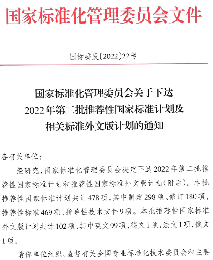 日前,《国家标准化管理委员会关于下达2022年第二批推荐性国家标准计划及相关标准外文版计划的通知》正式发布。