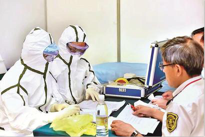 口岸传染病排查处置的现场技术操作环节,每组两位参赛选手根据题目,从流行病学调查到医学检查,从样本采集到快速检测都井井有条。 (钟志键 摄)