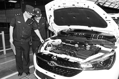 近日,芜湖检验检疫局对辖区内的出口质量安全示范企业奇瑞汽车股份有限公司进行了年度日常监管,重点检查了企业质量管理体系的运行情况。据统计,今年1月至7月,奇瑞汽车出口销量达63330辆,同比增长37.4%,其中7月出口销量9013辆,同比增长49%。图为该局检验人员对其主要出口汽车型号生产线进行监督抽查。 (王 海 摄)