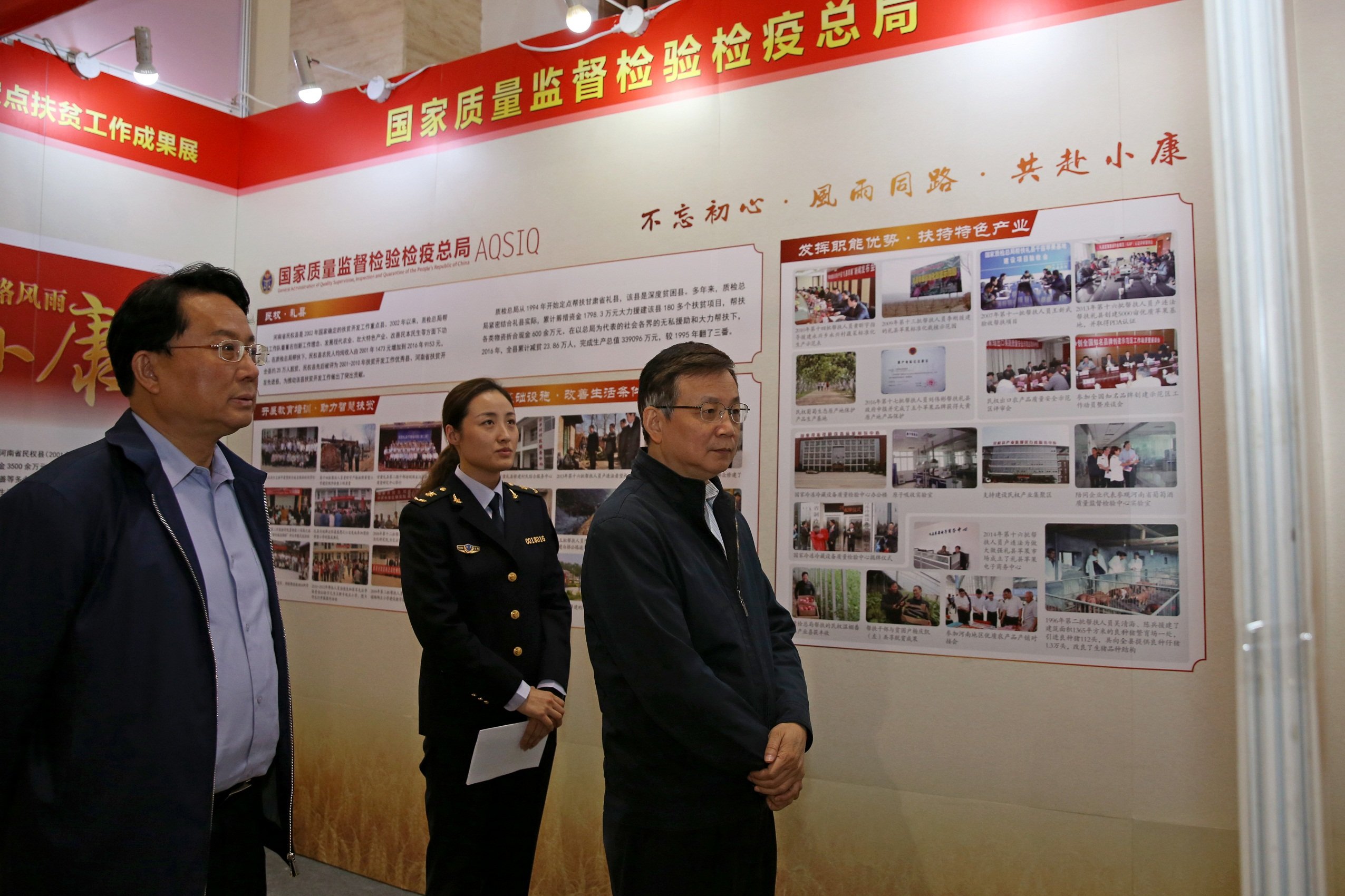 10月10日,中央国家机关定点扶贫工作成果展开幕式在全国农业展览馆举办。中央书记处书记、国务委员兼国务院秘书长、中央国家机关工委书记杨晶出席并讲话。质检总局党组书记、副局长侯建国代表质检总局党组出席开幕式,并参观展览。 杨晶同志专门听取了质检总局定点扶贫工作成果汇报,并鼓励我局保持劲头,继续做好定点扶贫工作。我局展板主题为“不忘初心 同路风雨 共赴小康”,分为前言、展示扶贫成果、加强组织领导三个部分,重点展示了在产业开发、改善民生、教育培训等方面所取得的成果。 质检总局始终坚定不移地贯彻落实党中央、国务院扶贫开发工作总体部署和要求,先后帮扶河南渑池、河南民权和甘肃礼县三个国家级贫困县,坚持发挥质检职能优势,从产业开发上下功夫,扶贫输血和扶智造血两手抓,显著改善了定点扶贫县群众的物质生活条件和精神面貌,促进了当地经济和社会事业发展,总局扶贫办也多次获得国务院扶贫开发领导小组的先进表彰。