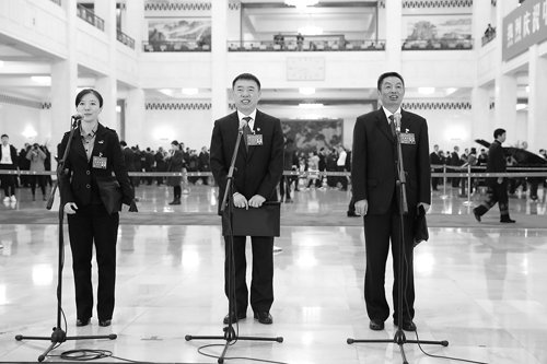 10月18日,中国共产党第十九次全国代表大会在北京人民大会堂开幕。这是大会开幕式前,薛莹、李万君、许启金代表(自左至右)接受采访。新华社记者陈建力 摄