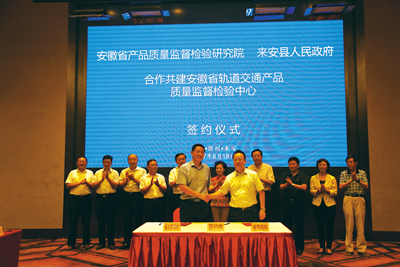 安徽省质检院院长何汉翔(前右)参加与来安县政府合作共建省级轨道交通产品质检中心签约仪式