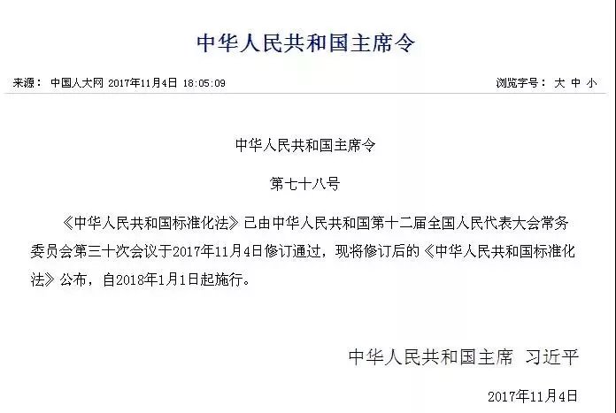 十二届全国人大常委会第三十次会议11月4日表决通过了新修订的标准化法。