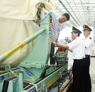工作人员对上海波音公司进境飞机维修零件进行查验