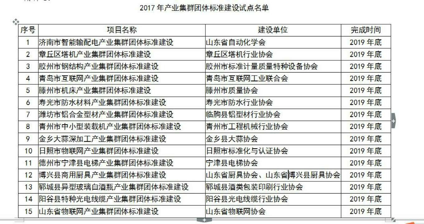 山东决定在阳谷县特种光电线缆产业集群、济南市智能输配电产业集群、滕州市机床产业集群等15个产业集群开展团体标准建设试点。用标准联通产业集群产业链、价值链、供应链,实现产业集群各领域、全过程、全产业链团体标准全覆盖,推动形成一批影响力强、辐射带动作用大的支柱性、主导性和特色性产业集群。
