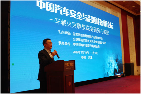 2017年11月9日至10日,由国家质检总局缺陷产品管理中心和公安部消防局天津火灾物证鉴定中心联合举办的中国汽车安全与召回技术论坛在天津举行,本次论坛的主题为“车辆火灾事故深度研究与预防”。国家质检总局执法督查司调研员侯纪伟和公安部天津消防研究所副所长邓慨廉到会致辞。论坛由中国标准化研究院副院长巫小波主持,由中国标准科技集团有限公司承办。此次论坛是我国首次关于车辆火灾事故深度研讨的学术会议,受到了行业的广泛关注,共有来自120家政府机构、事业单位、科研机构以及汽车整车及零部件企业的300余人参会。