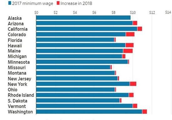 美国18个州从1月1日开始提高最低工资标准