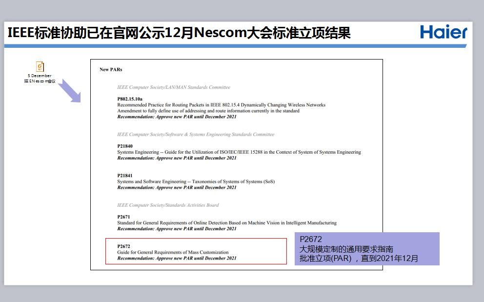 记者从6日举行的海尔集团2018创新年会上了解到,总部位于美国纽约的电气电子工程师学会(IEEE)新标准委员大会通过了一项由中国海尔主导的大规模定制国际通用要求标准的建议书,这是电气电子工程师学会创办半个世纪以来,唯一以模式为技术框架制定的国际标准,也是首次由中国企业牵头制定IEEE的国际标准。