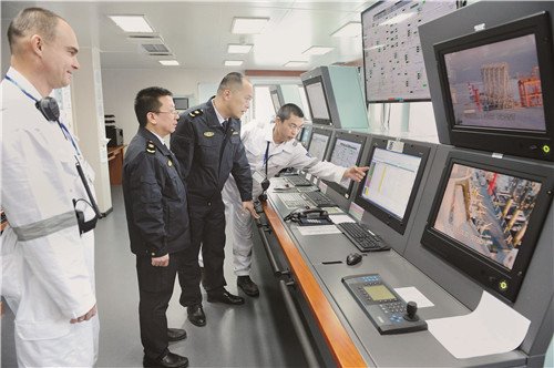春节前夕,两艘装载进口液化天然气(LNG)的货轮分别抵达位于天津南疆港区的中海油天津LNG接收站和位于天津大港港区的中石化天津LNG接收站,共计装载10.57万吨LNG,用以保障京津冀和鲁北地区冬季供暖及生产用气。卸货期间,天津检验检疫局严格监管取样和制样过程,实验室及早出具检测结果,保障企业按期结算和天然气及时供应。图为检验检疫人员在货轮上查看船舱计量设备运行情况。 本报记者 魏 宁 摄