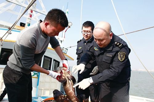 检验检疫人员在对台小额贸易码头查看进口活石斑鱼质量