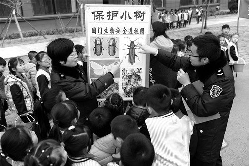 日前,黄岛检验检疫局青年志愿者走进青岛开发区第二实验小学植树活动现场,给同学们上了一堂以“保护小树”为主题的国门生物安全大课堂。生动活泼的讲解和直观的昆虫标本深深地吸引了同学们,在他们的心里种下了国门生物安全的种子。范 栋 摄